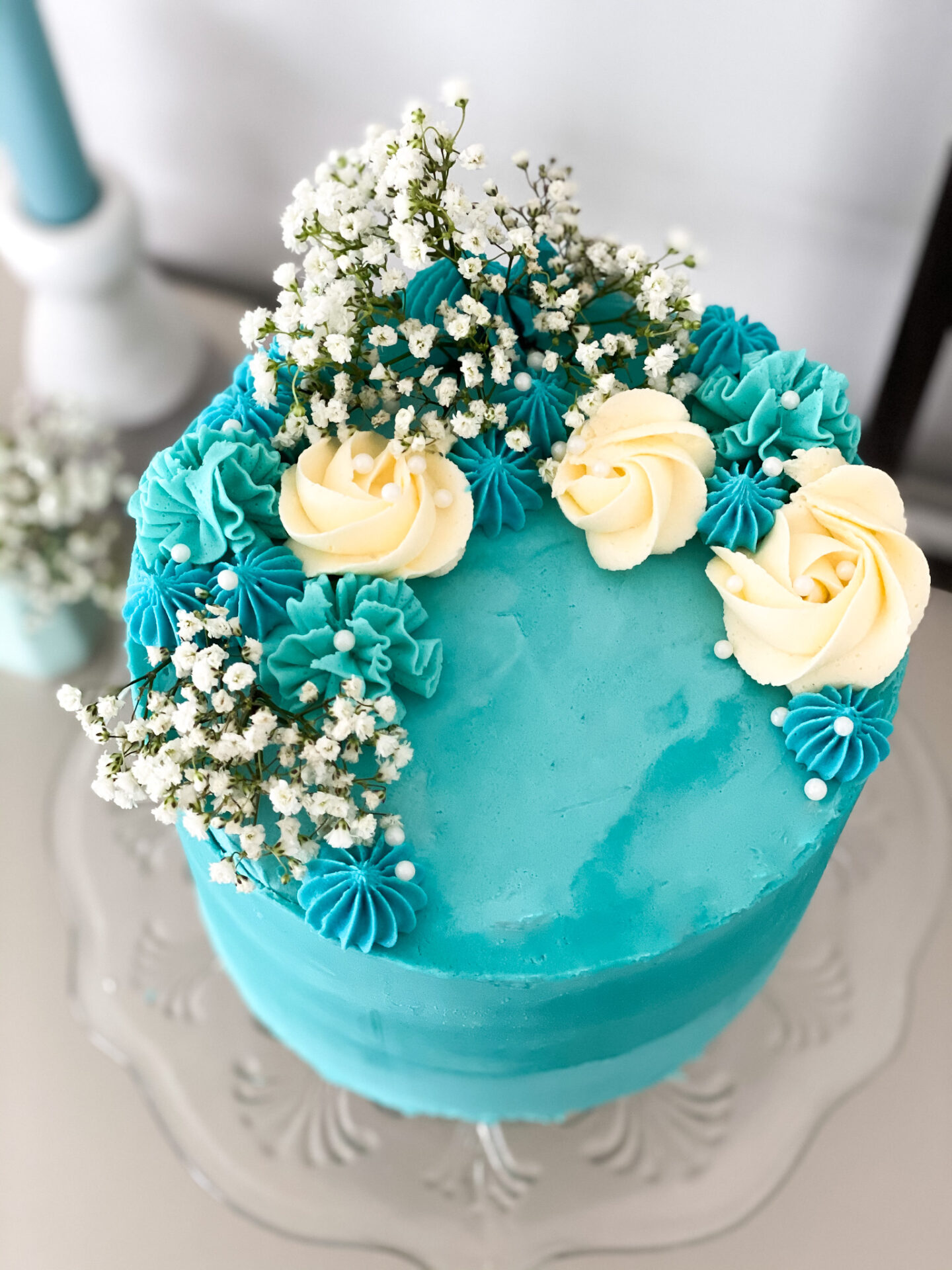 Setjið fyrsta botninn á kökudisk, gott er að setja örlitla rjómaslettu undir botninn svo kakan geti ekki runnið af disknum.